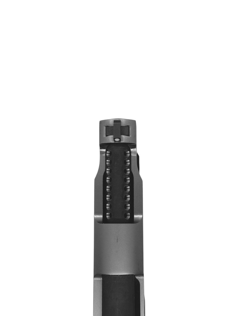 Sistema Hibrycomp V16: 16 perforaciones para compensación de gases que minimizan retroceso y alce, aumentando la estabilidad del disparo.