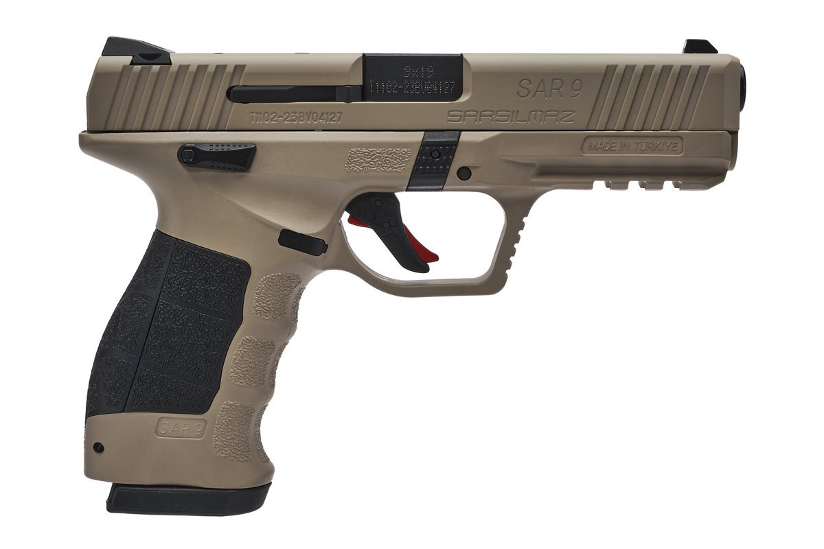 SAR9 SAFARI 9mm. Pistola full size con seguro externo ambidiestro, gatillo con seguro integrado y diseño ergonómico. Incluye 2 cargadores y kit de limpieza. Estética táctica en color SAFARI.